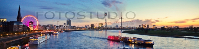 Skyline von Düsseldorf mit St. Lambertus, Schlossturm, Riesenrad "Wheel-of-Vision" auf dem Burgplatz, Rheinturm, Rheinkniebrücke, Landtag, Medienhafen mit Gehri-Bauten und Hyatt bei Nacht und der beleuchteten Rheinuferpromenade.